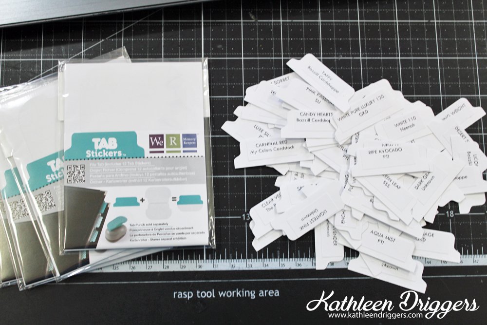 The divider pages are made using any brand 110 pound white cardstock I happen to use Georgia Pacific) but you can use any brand cardstock that is sturdy enough to be a divider.  I also use my We R Memory Keepers Tab Punch and Tab Stickers.  I printed the color name and brand of the cardstock out on Avery 8167 Return Label Stickers and cut them to fit the tabs.
