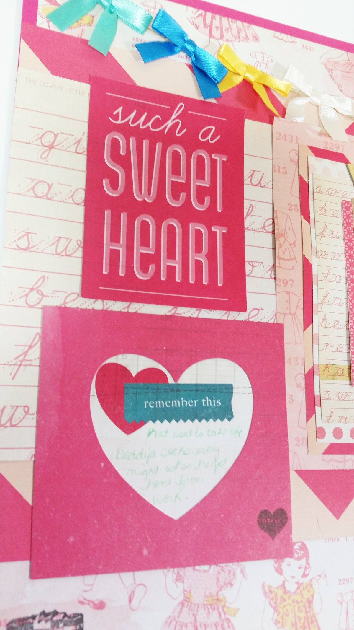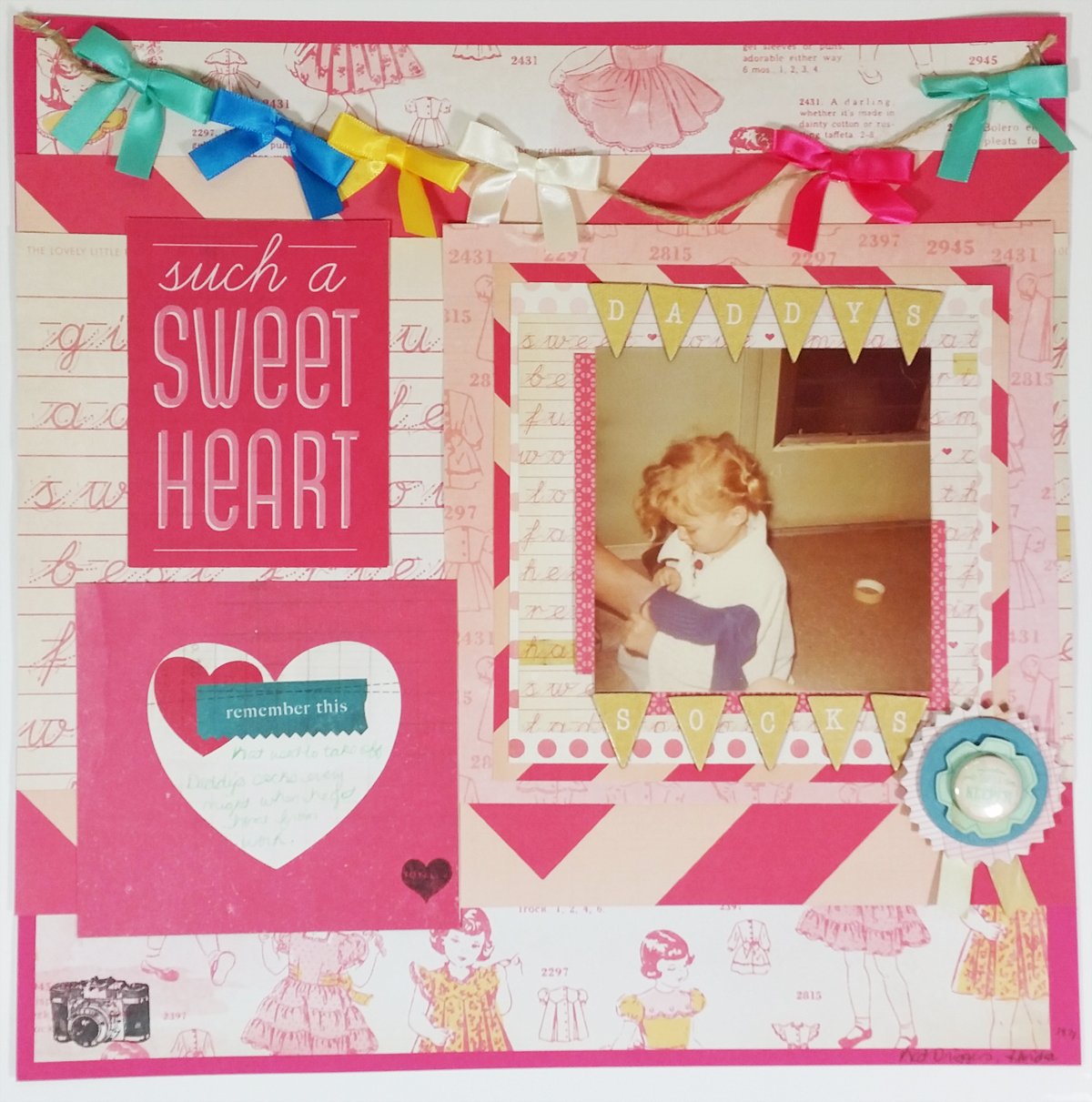 Hi all! Today I have a layout to share with you along with the process video which features a photograph of me when I was just a toddler putting my father’s socks on. Apparently, this was a daily routine and my parents got a kick out of it so I decided to scrap the photo even though it’s a low quality, older photo. I used the Oh Darling Collection by Crate Paper (links are below the post). Here are some still shots of the layout.