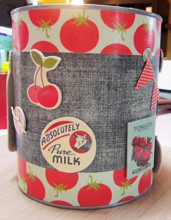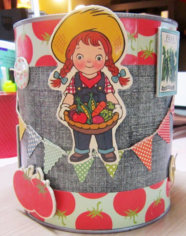 Seriously though, my sister in law is turning 30, she lives on a farm and I couldn’t think of anything to buy her so I thought I’d make her something. I decided to alter this tin can and make it a gardening supply can and fill it full of gardening supplies and goodies. She can use it as a decoration or to put seeds in, or whatever she wants once she gets it. Until then it’s my job to make it cute, so I started by choosing some paper and embellishments to dress it up. Here’s how she started out.