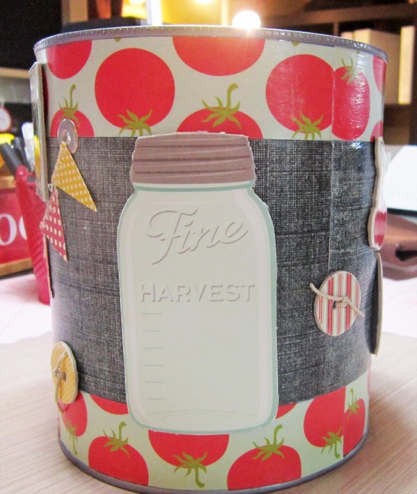 Next, I punched two holes on either side of the can, set two eyelets using my Big Bite, sewed the “Sew Fun” banners from the collection and draped one across the can. I then took the chip n’ stick chipboard embellishments, laminated them in my xyron machine and cut them out. I hot glued them all around the can as embellishments and this is what I got.
