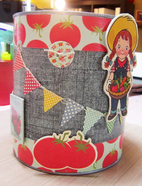 Kind of naked and plain…so I went with the whole farm theme and chose the Farm Girl collection by October Afternoon. I used scor-tape to adhere the paper onto the tin can and then applied two thin coats of mod podge and this is what I had so far.