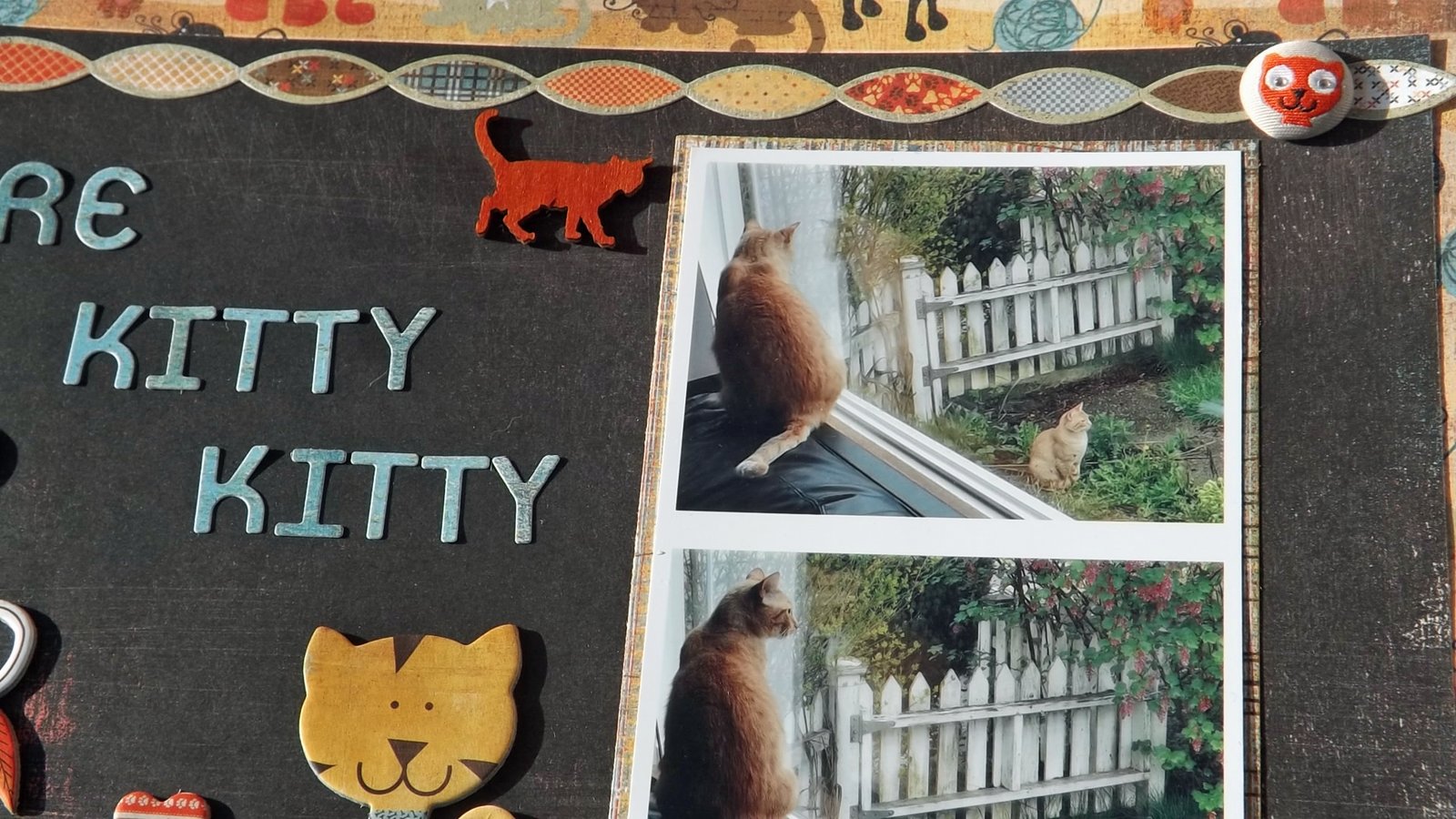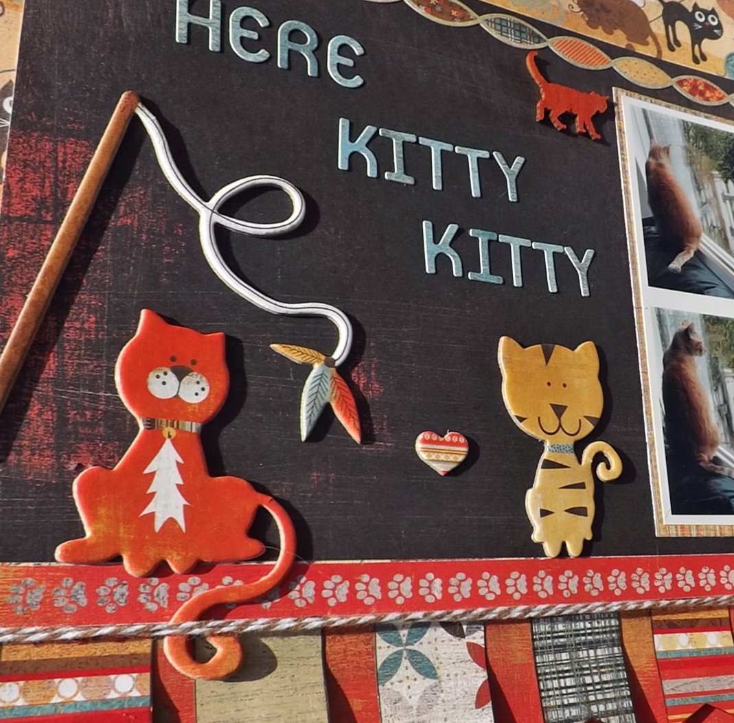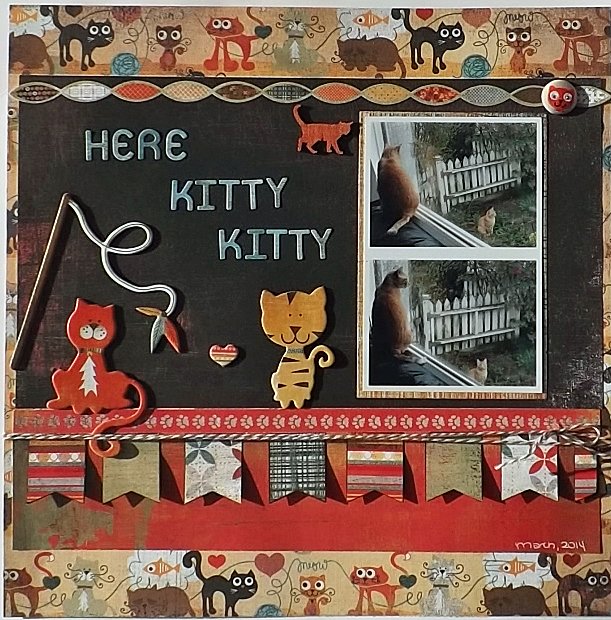 Hi guys, today I have a layout to share with you called “Here Kitty Kitty”. It is a picture of my son’s cat sitting in the window looking at and “talking to” his outside buddy. They meow at one another and go from window to window. It’s hilarious. Anyway, one day I got lucky and snapped these photos and knew I needed to scrap them for my son’s album. He LOVES his cat!