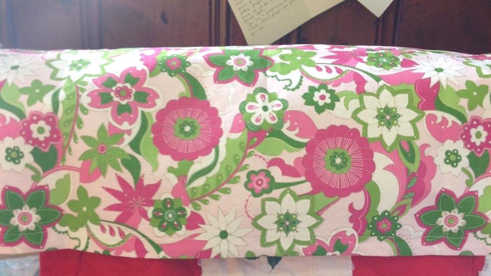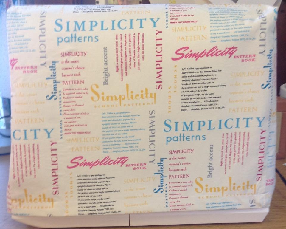 My solution? A hand made sewing machine cover! No I didn’t make it myself, (it takes too much skill LOL). Jane Summers Cox made it for me and she even let me choose the fabric to match my scrap room. It has an adjustable elastic band around the bottom so I can make it as loose or as tight as I want. Here is what my new cover looks like: