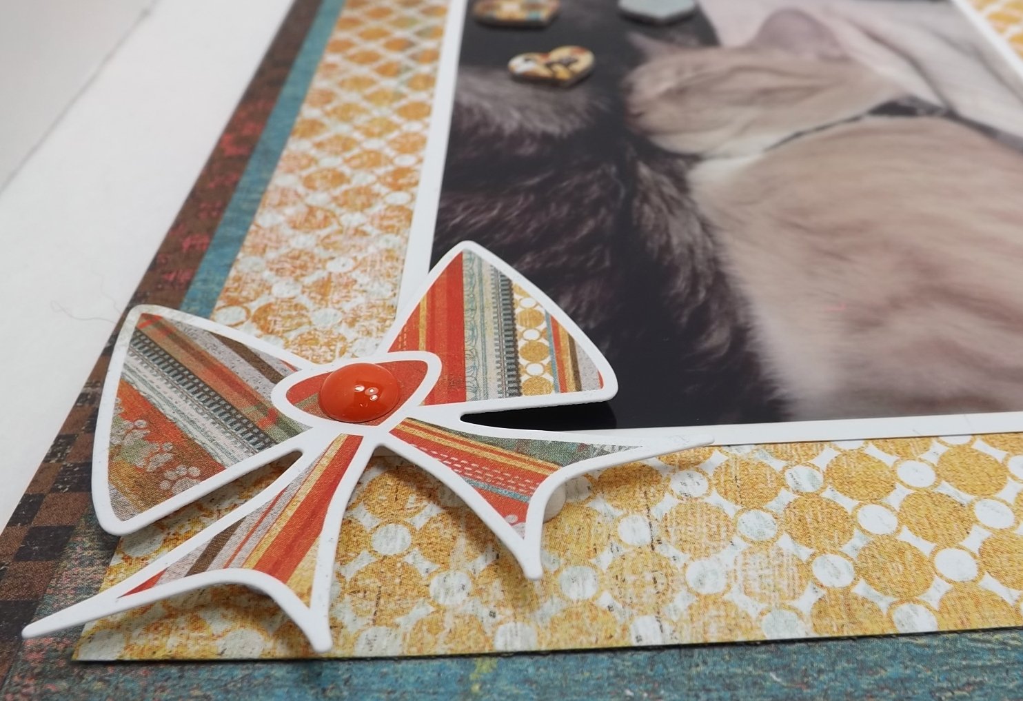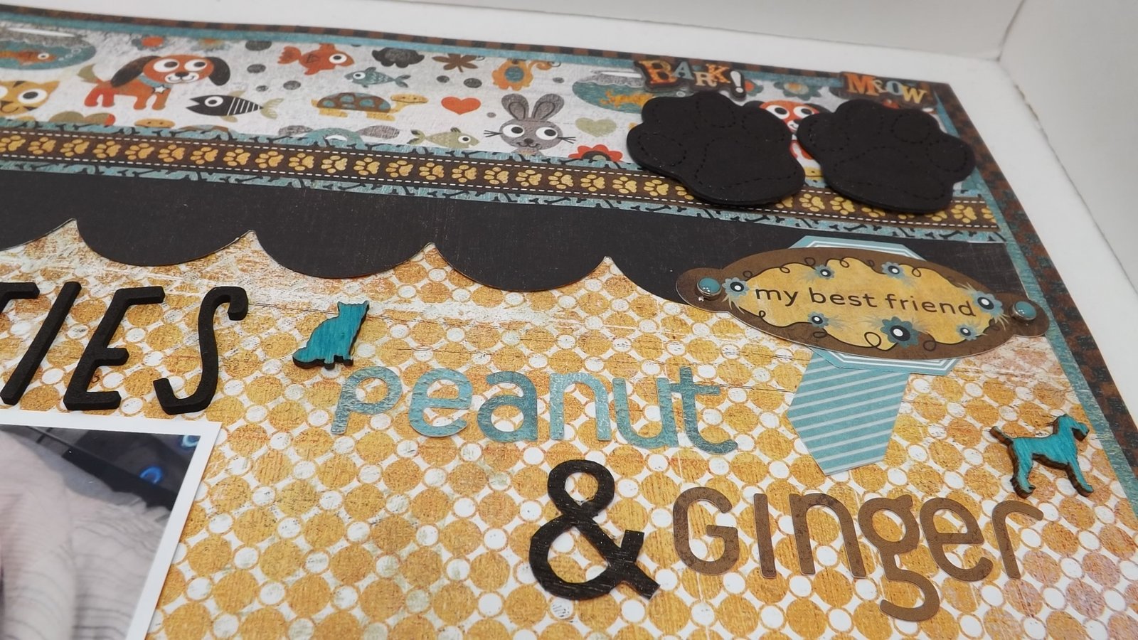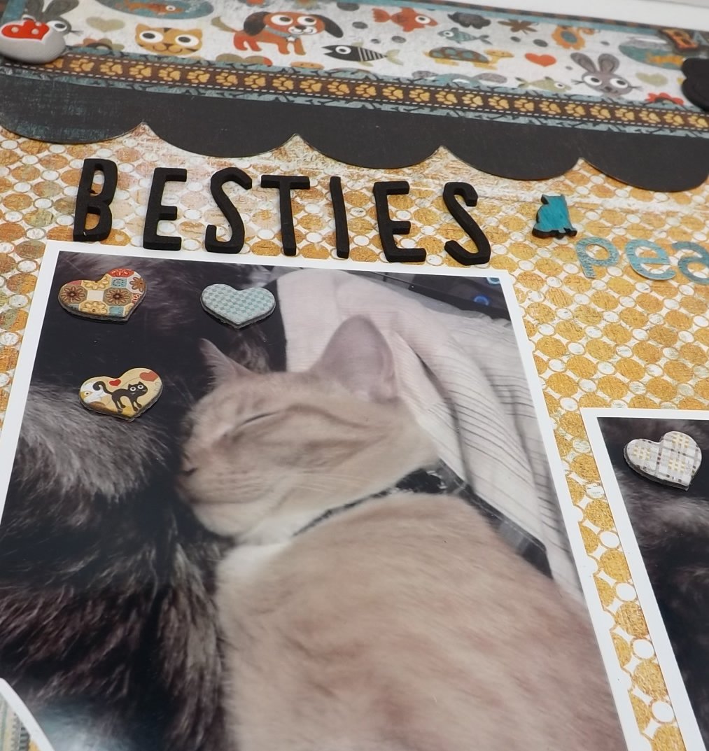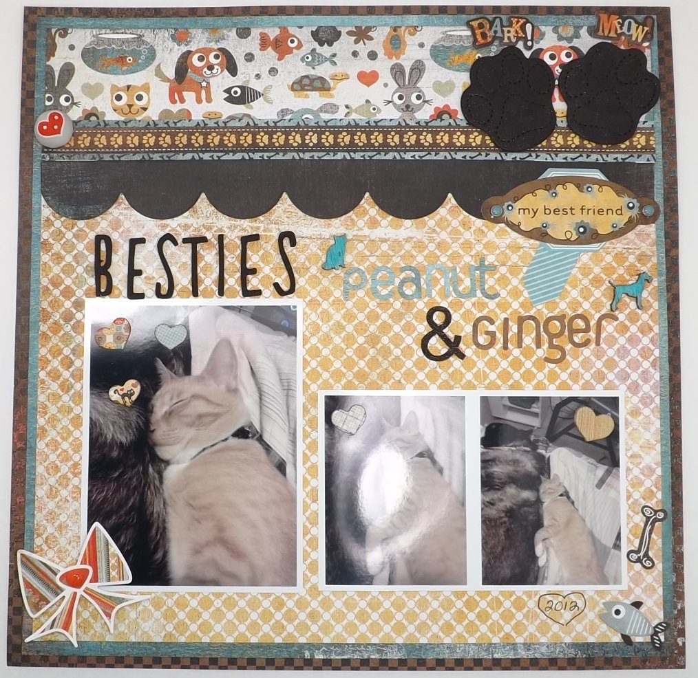 Today I’m sharing a layout I did of our angel baby, Ginger and my son’s cat “Peanut” snuggling on the bed. They loved each other to pieces!