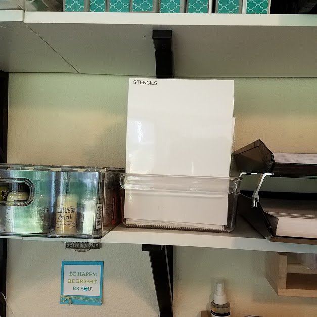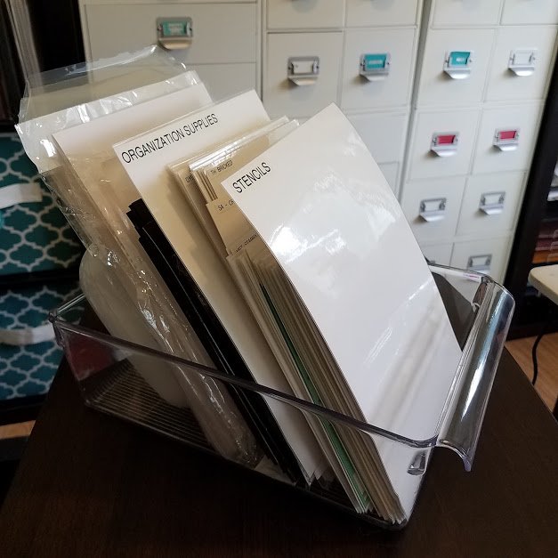 I store my stencils in an Interdesign Fridge Bin along with my organizational supplies. Here are some photos of the bin filled with my stencils and supplies.